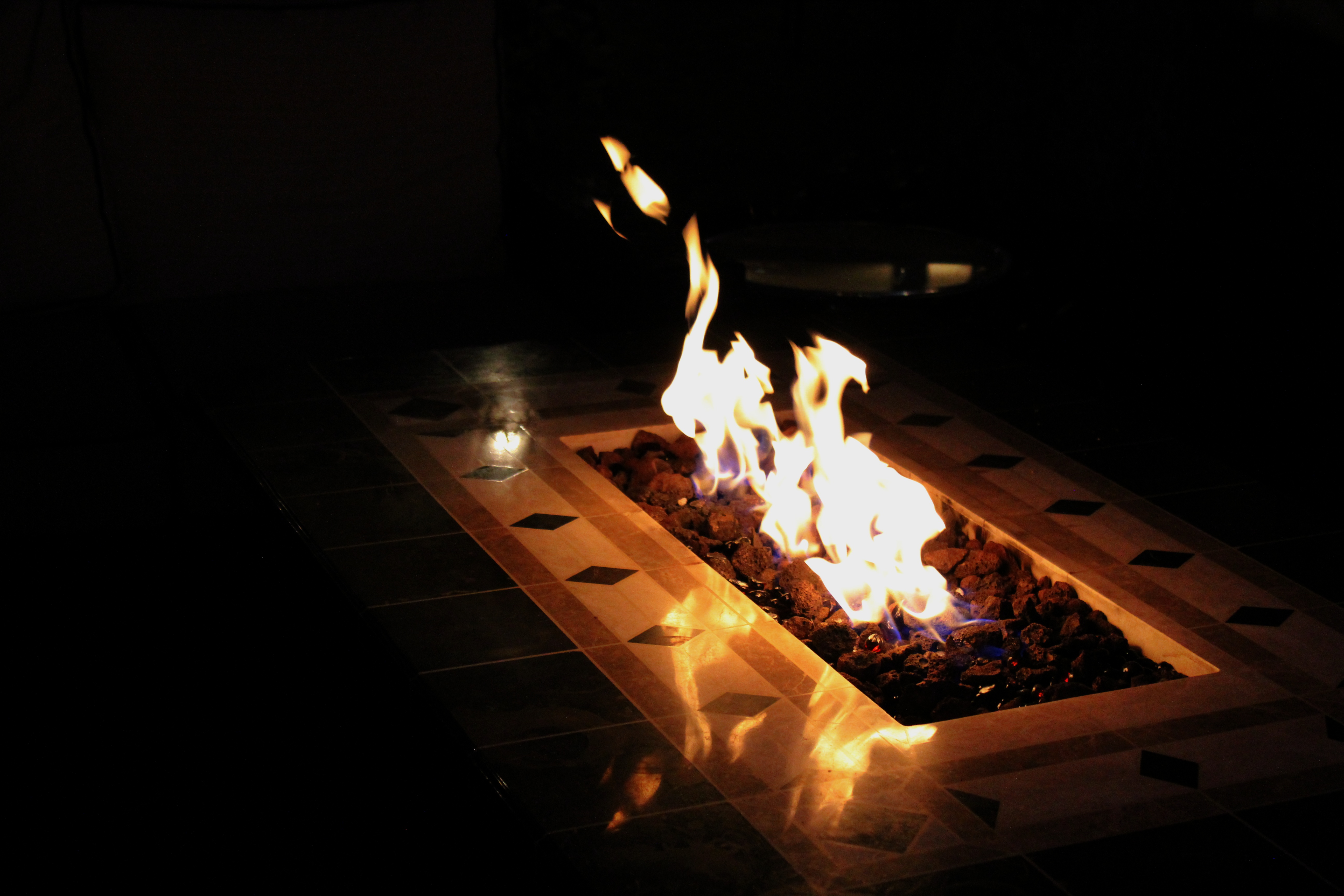 First thing I notice is outdoor seating equipped with tables and also lounging areas that have a fire pit.