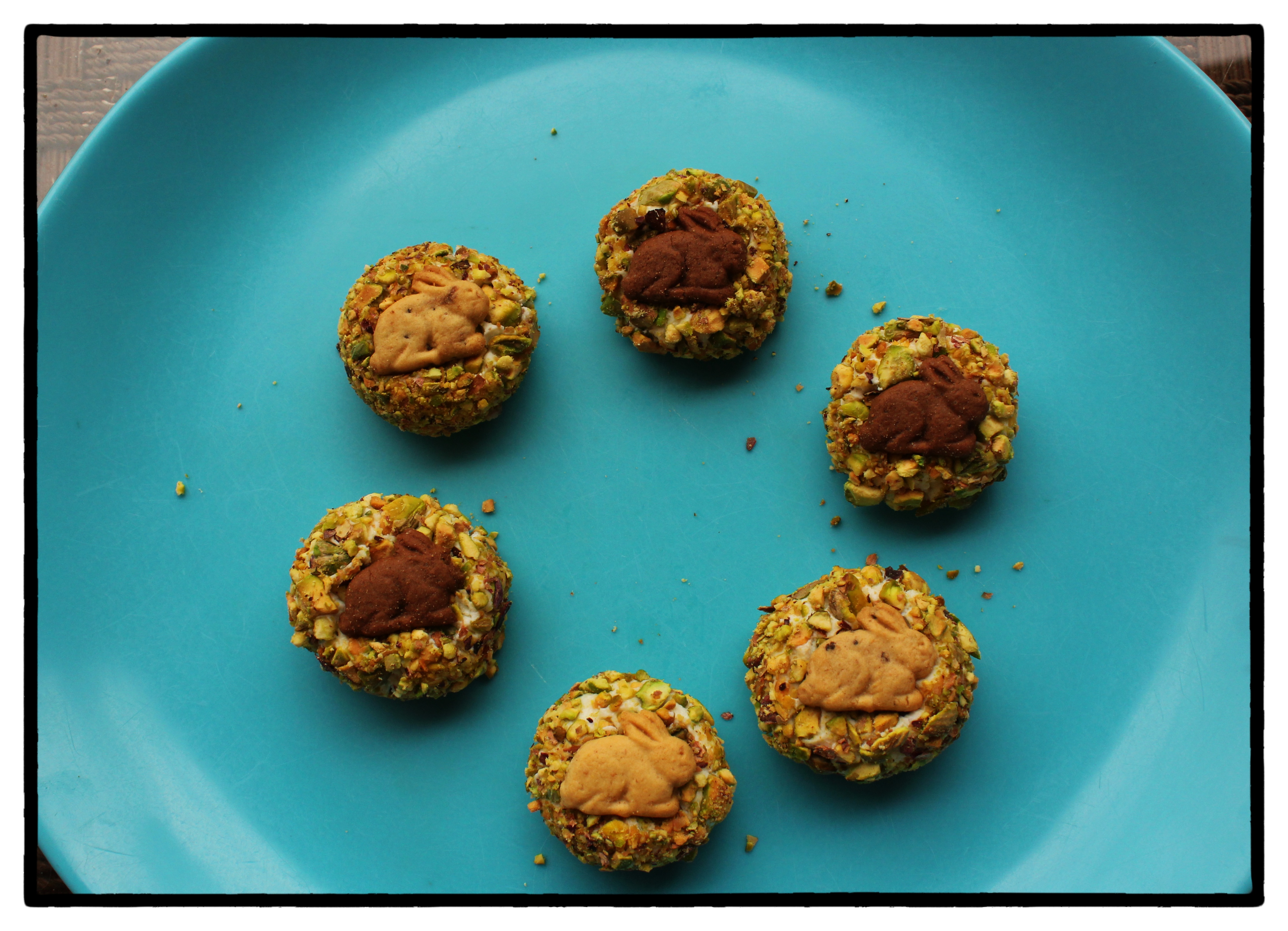 I came across this recipe: http://theyearinfood.com/2012/04/honey-goat-cheese-pistachio-truffles.html and decided to make them today. Its Easter & I happened to have some bunny cookies from Annie’s so I tweaked the original recipe to become thumbprint cookie truffles. Visuals below! Happy Easter & Passover from {TheSoFlaSage} 🙂