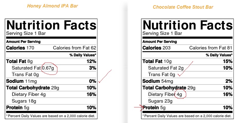 Currently they have bars available in two flavors. The chocolate stout one was my favorite of the two. But wait- it gets better, they are mostly nutritious, too! Not too hefty on the saturated fat content, low/no sodium. Decent amount of protein as well as a nice serving of fiber. Only downfall would be the sugar content.