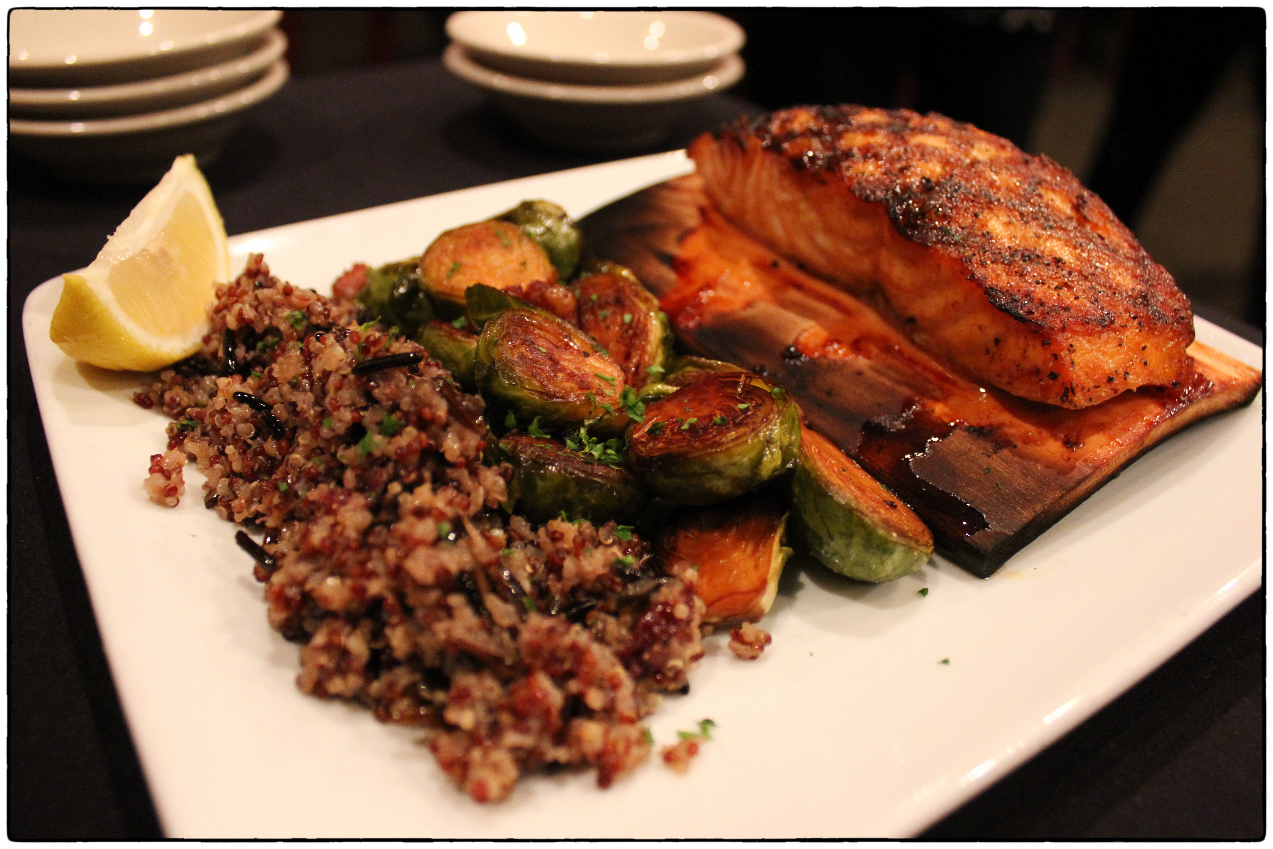 Cedar Plank Salmon with Citrus & Honey Glaze, Ancient Rice and Brussels Sprouts