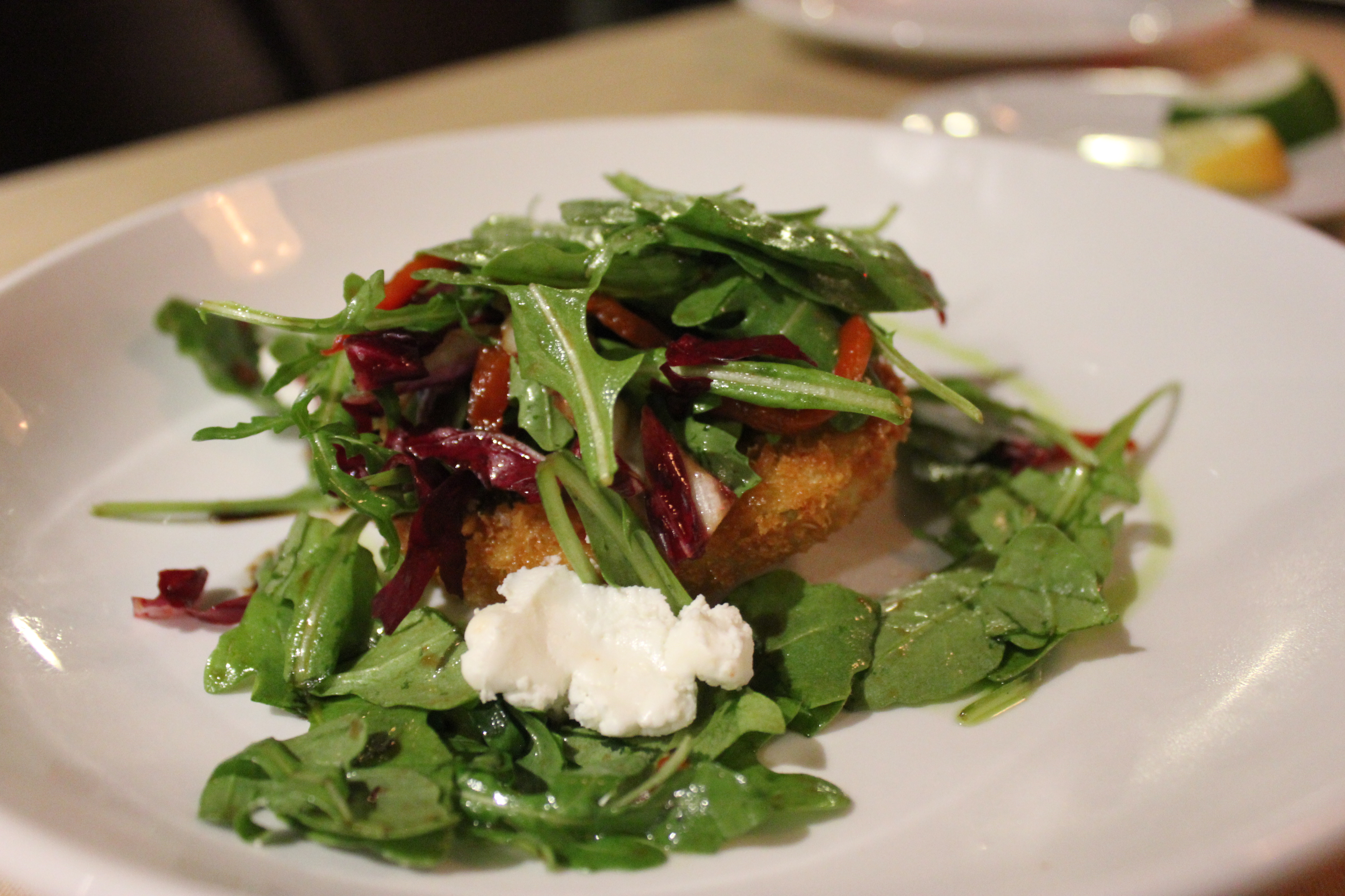Fried Green Tomatoes with Arugula, Radicchio, Roasted Red Peppers, Goat Cheese and Brown Sugar Balsamic Vinaigrette.