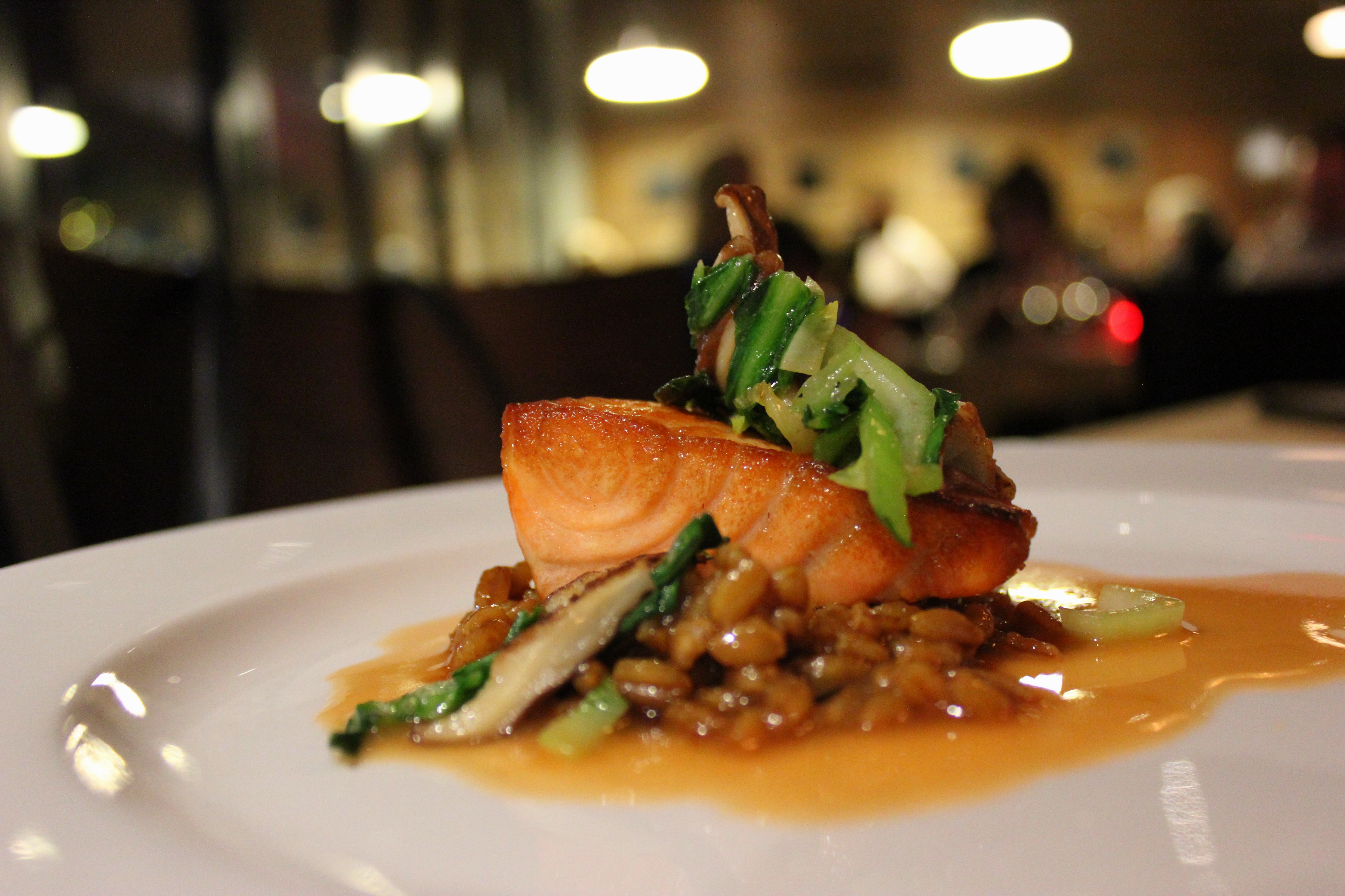 Pan Roasted Salmon with Lemon Spiked Farro, Shiitake Mushrooms, Bok Choy and Blood Orange Reduction