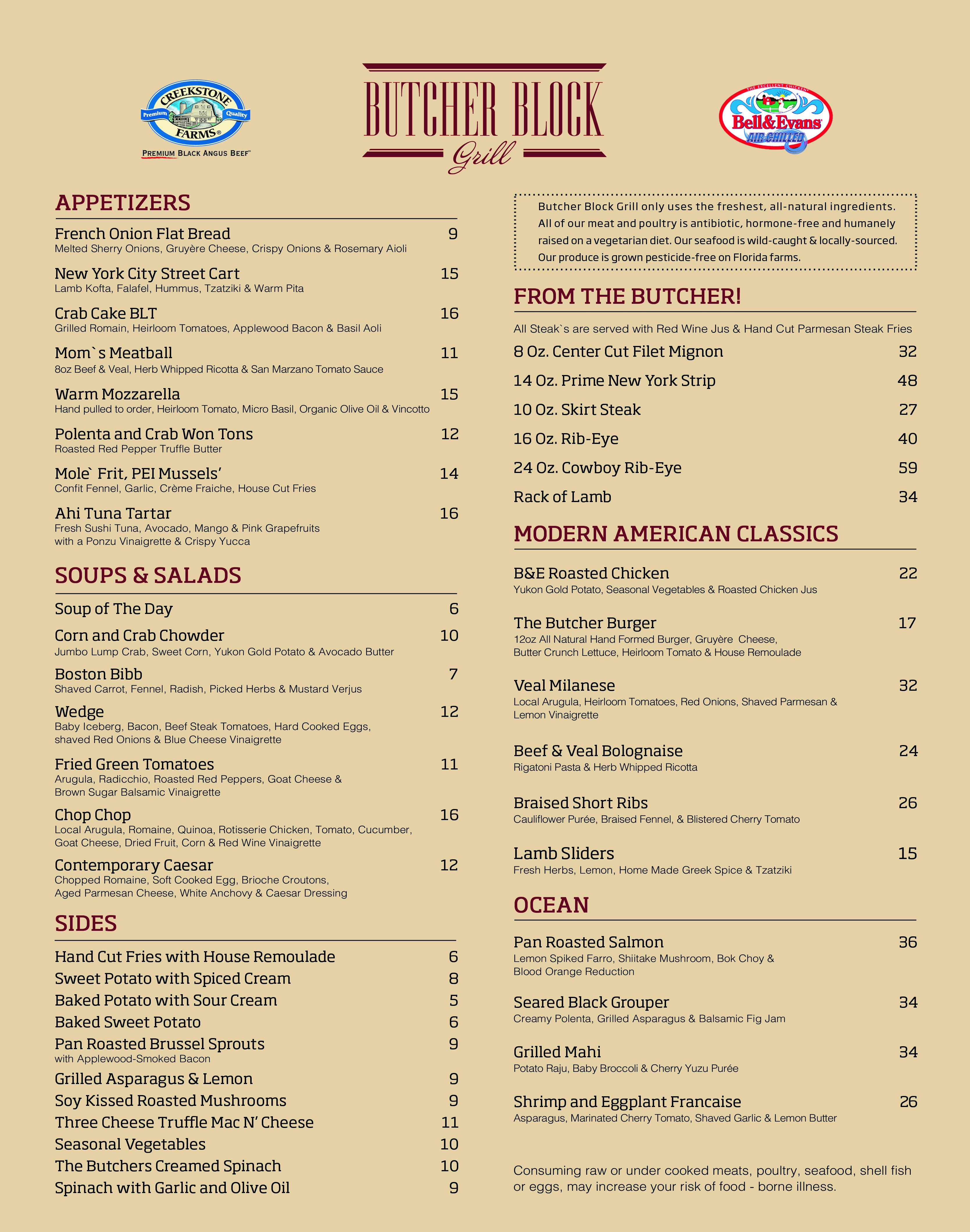 Butcher Block Grill, the all natural steakhouse located in the Fountains Center in Boca Raton, has just launched a new menu.