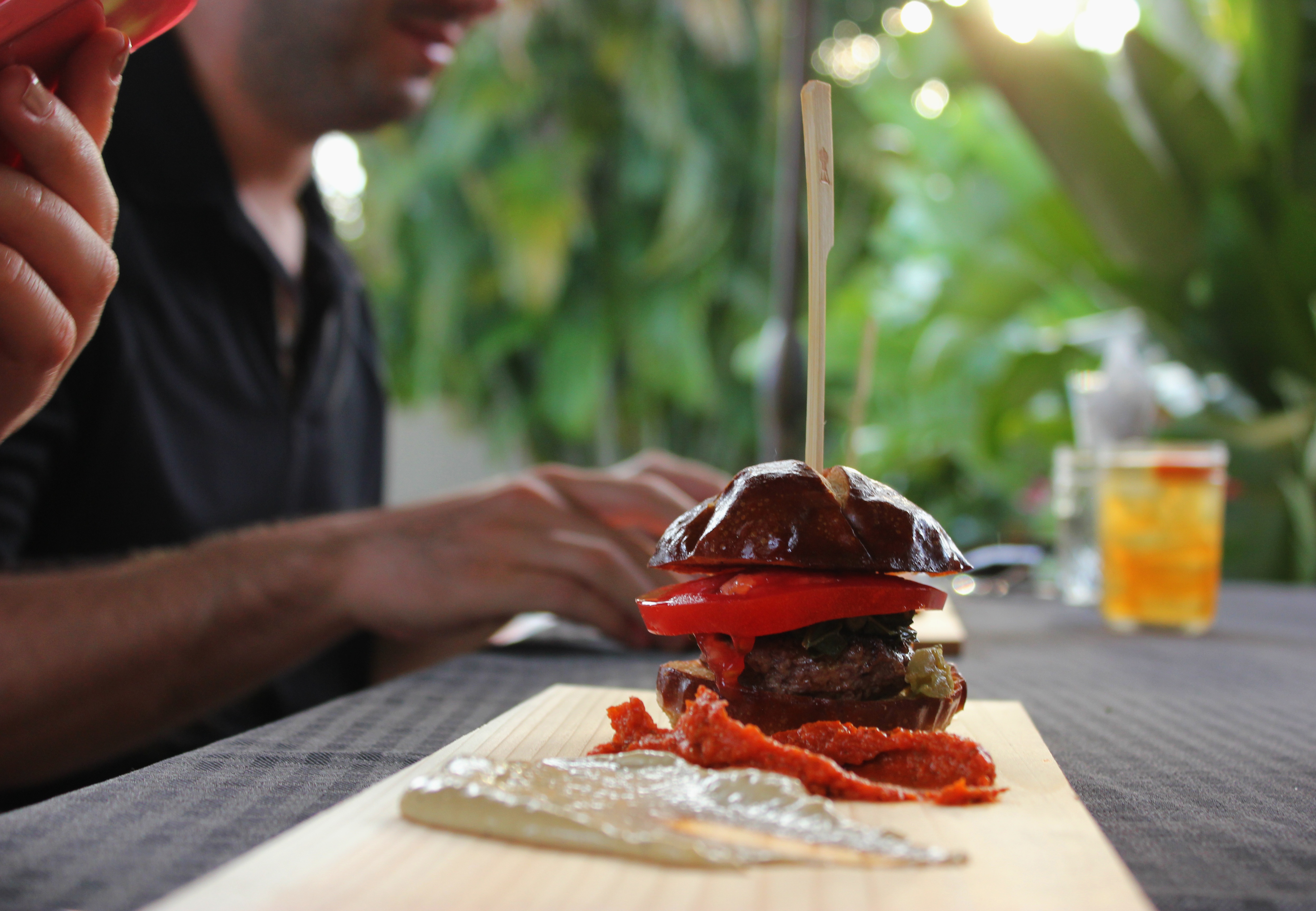 Burger on Pretzel Bun – Bacon + Ground Beef accompanied by Sundried Tomato Pesto and Charred Onion Aioli
