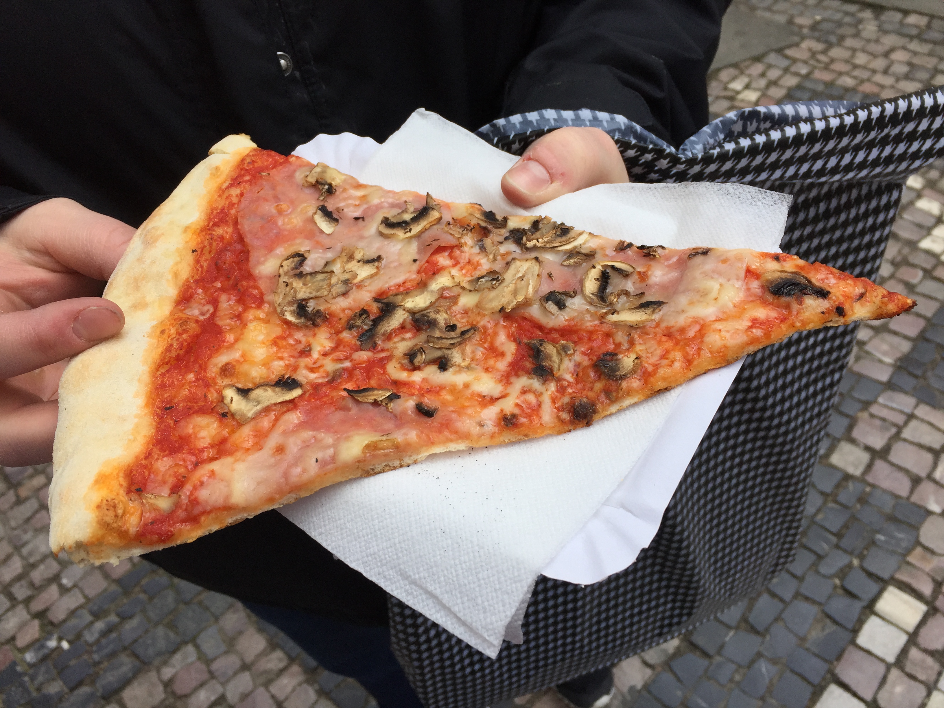 Pizza! Pretty good. The crust was very thin and it didn’t have much cheese on it.
