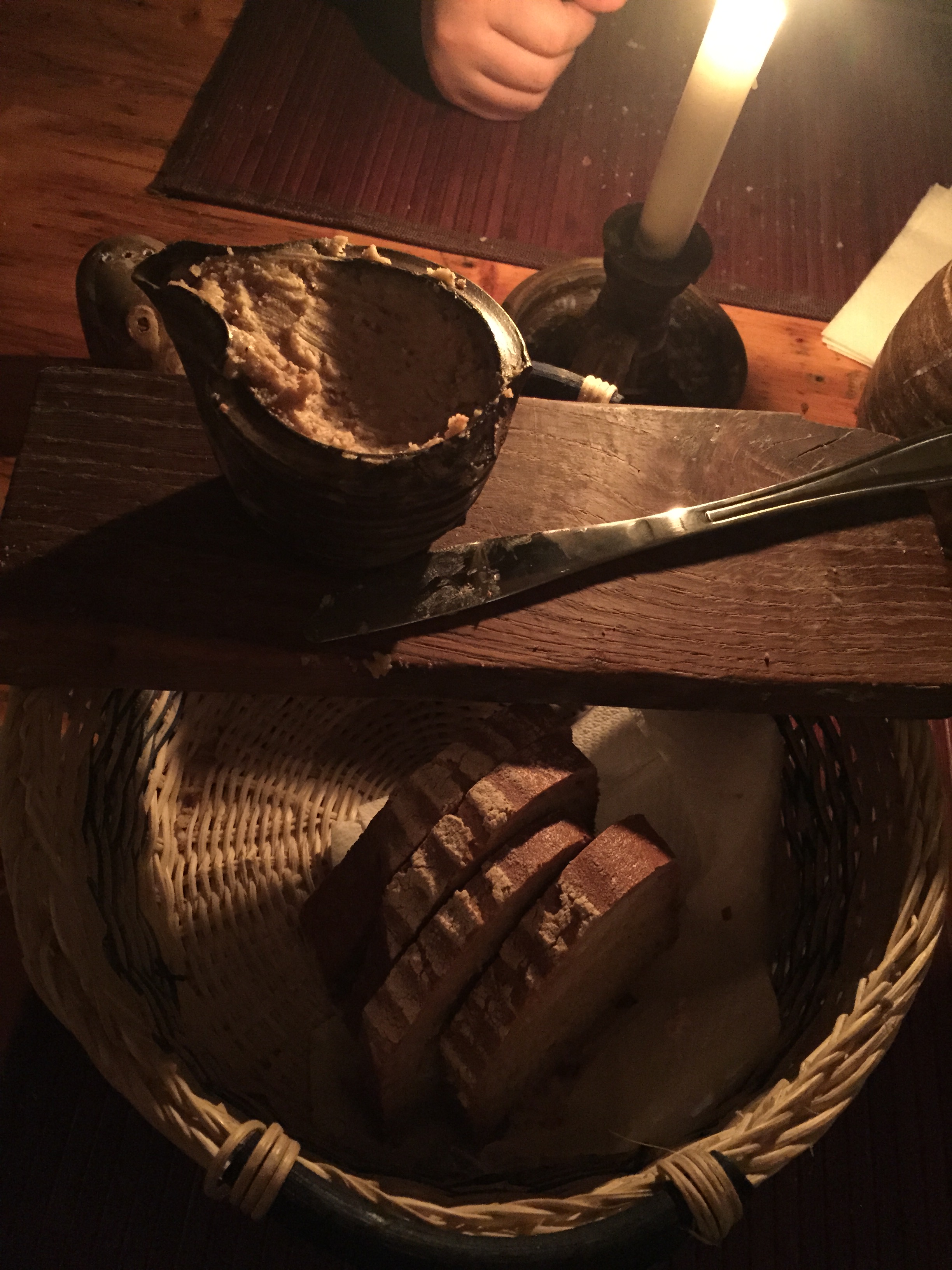 On the night that we arrived to Prague, we ate at the restaurant that was right next to our hostel. The hostel and restaurant alike were called Fontana. The restaurant had a dark, cozy, log cabin in the winter atmosphere. We were pleasantly surprised to find that it was so inexpensive! We ordered a lamb chop dish and a steak dish. Dinner came with bread and “butter”, which was actually chicken fat lard. We each drank a Pilsner Urquell, which is the most famous beer of the country and a Staropramen, which is a less popular Czech beer. The bill came to about $30 (USD), which was crazy cheap!