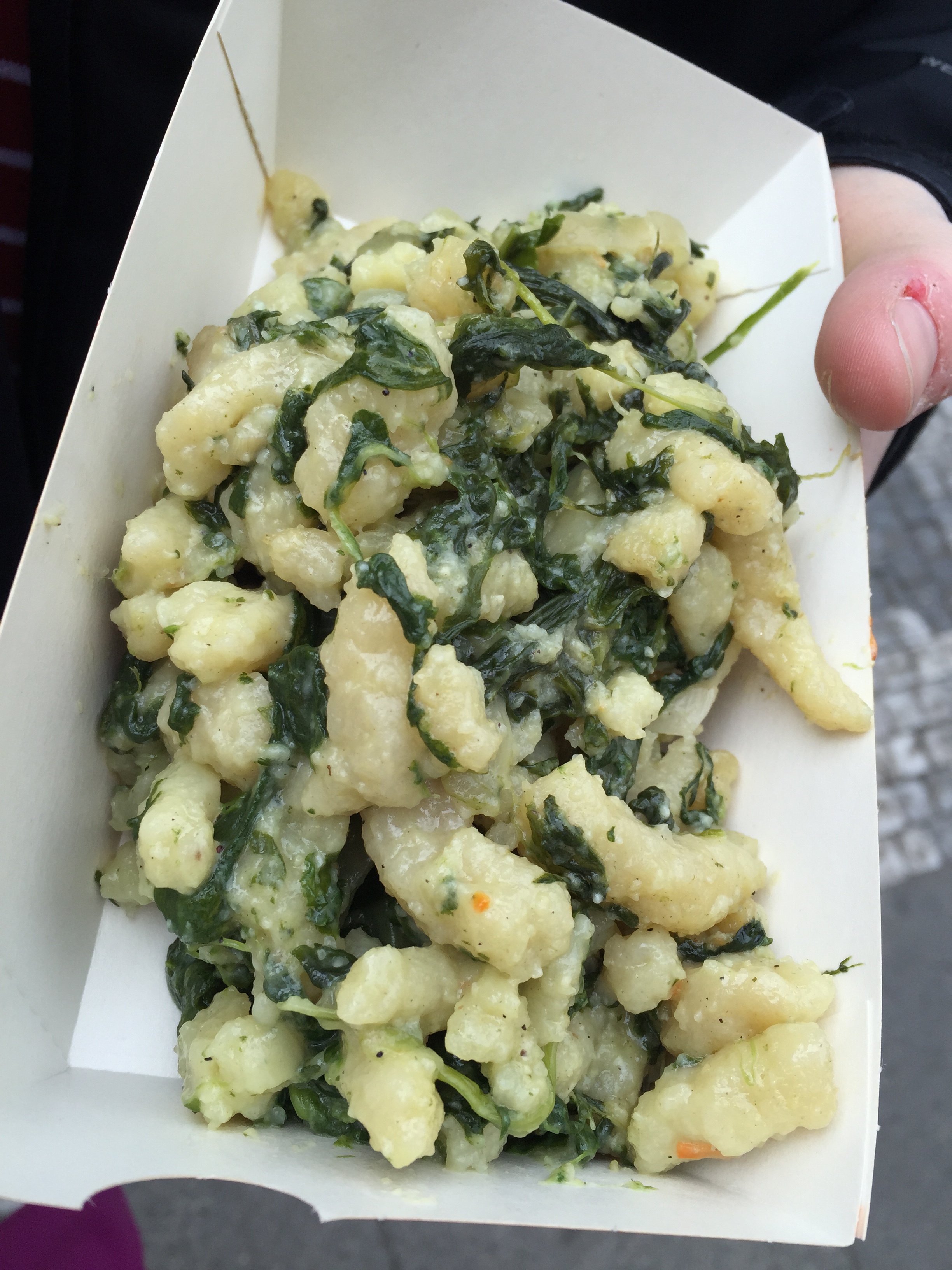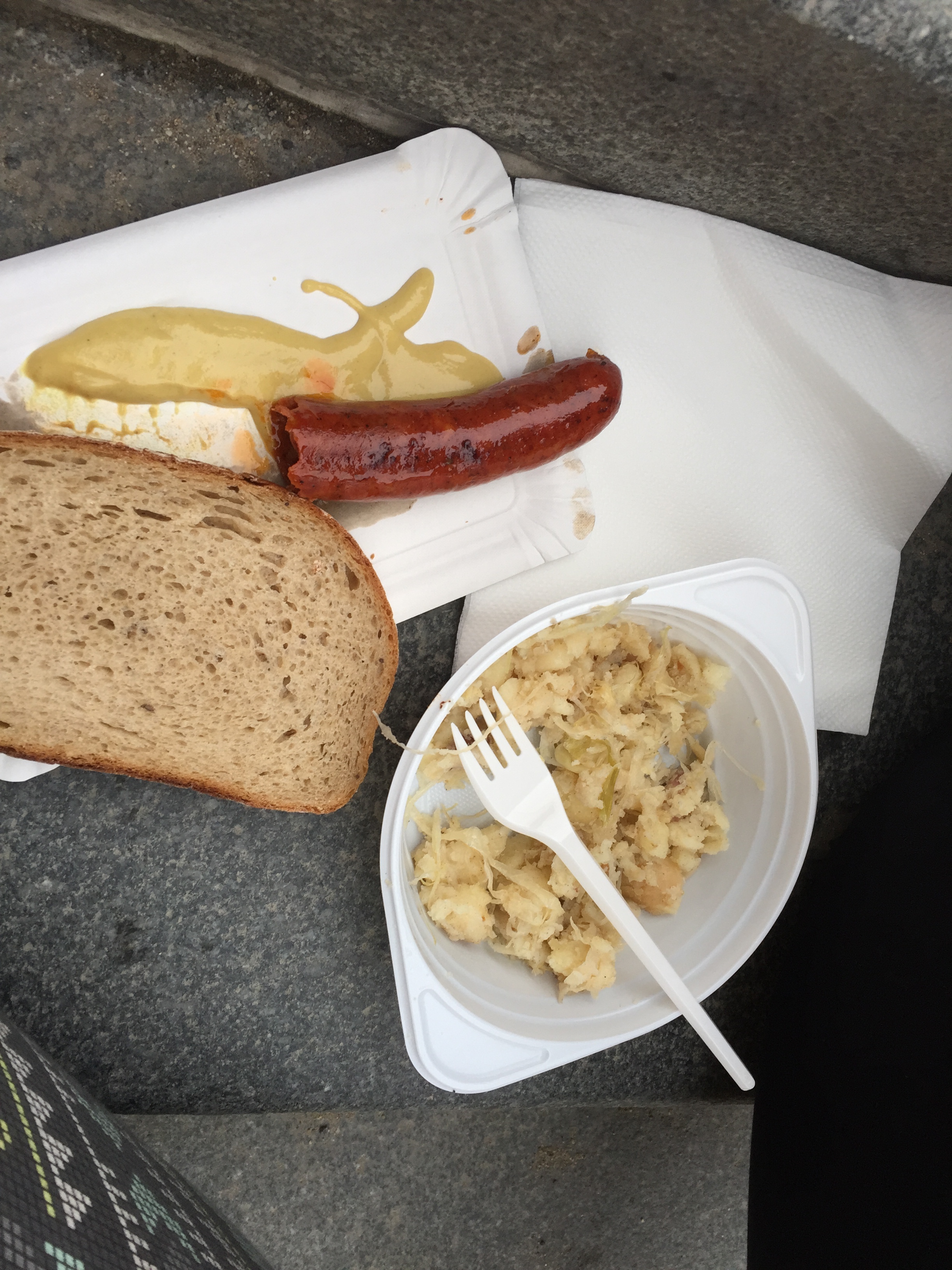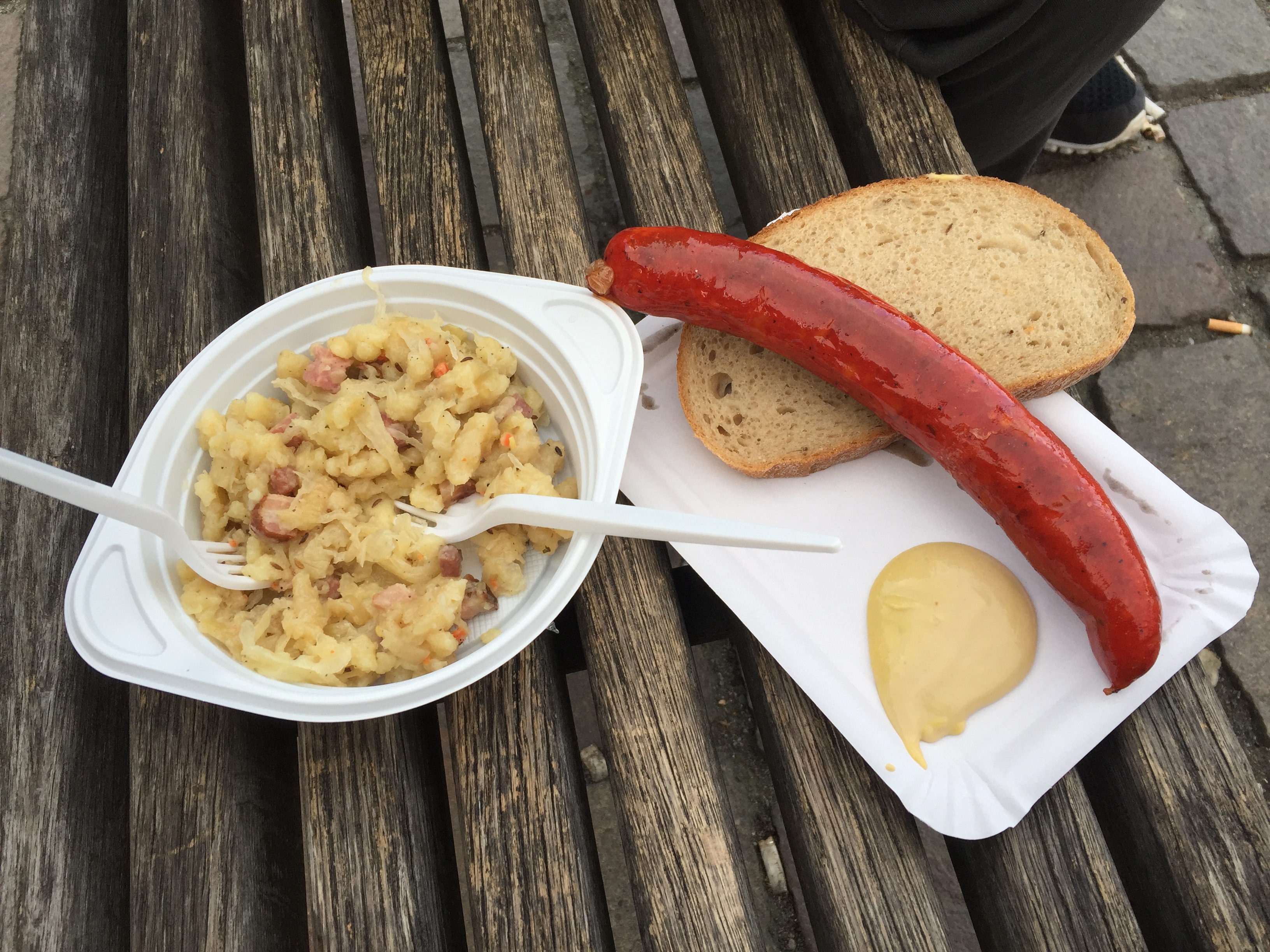 All of the markets had food displayed in this fashion. They also advertised prices such as “-39, for 100 grams” (about 1-2 USD) but you had to order at least 400 grams. At first we thought the prices were very cheap but realized that we were converting wrong. Whoops. Gnocchi, sauerkraut, and sausage dish and a paprika sausage.