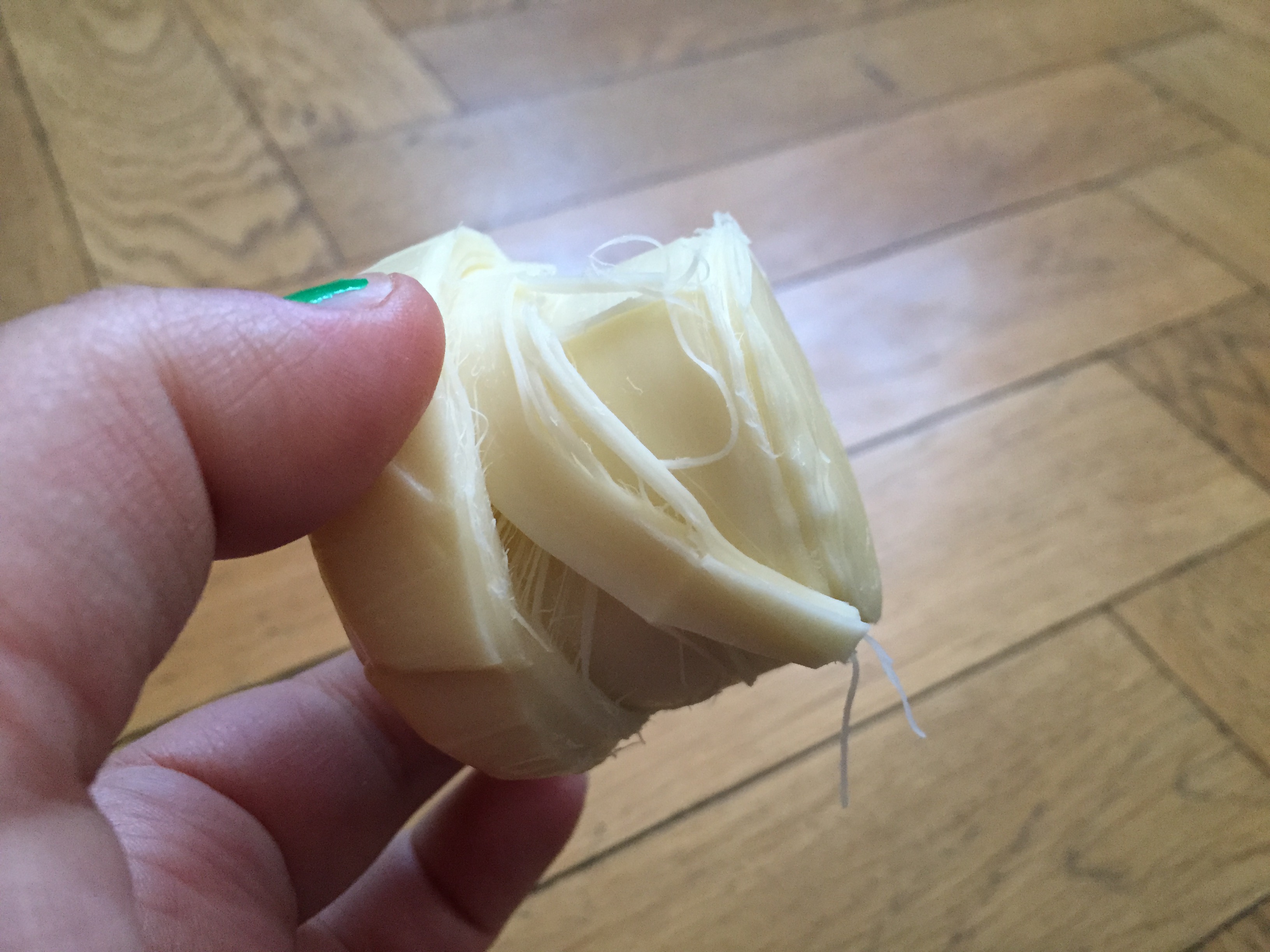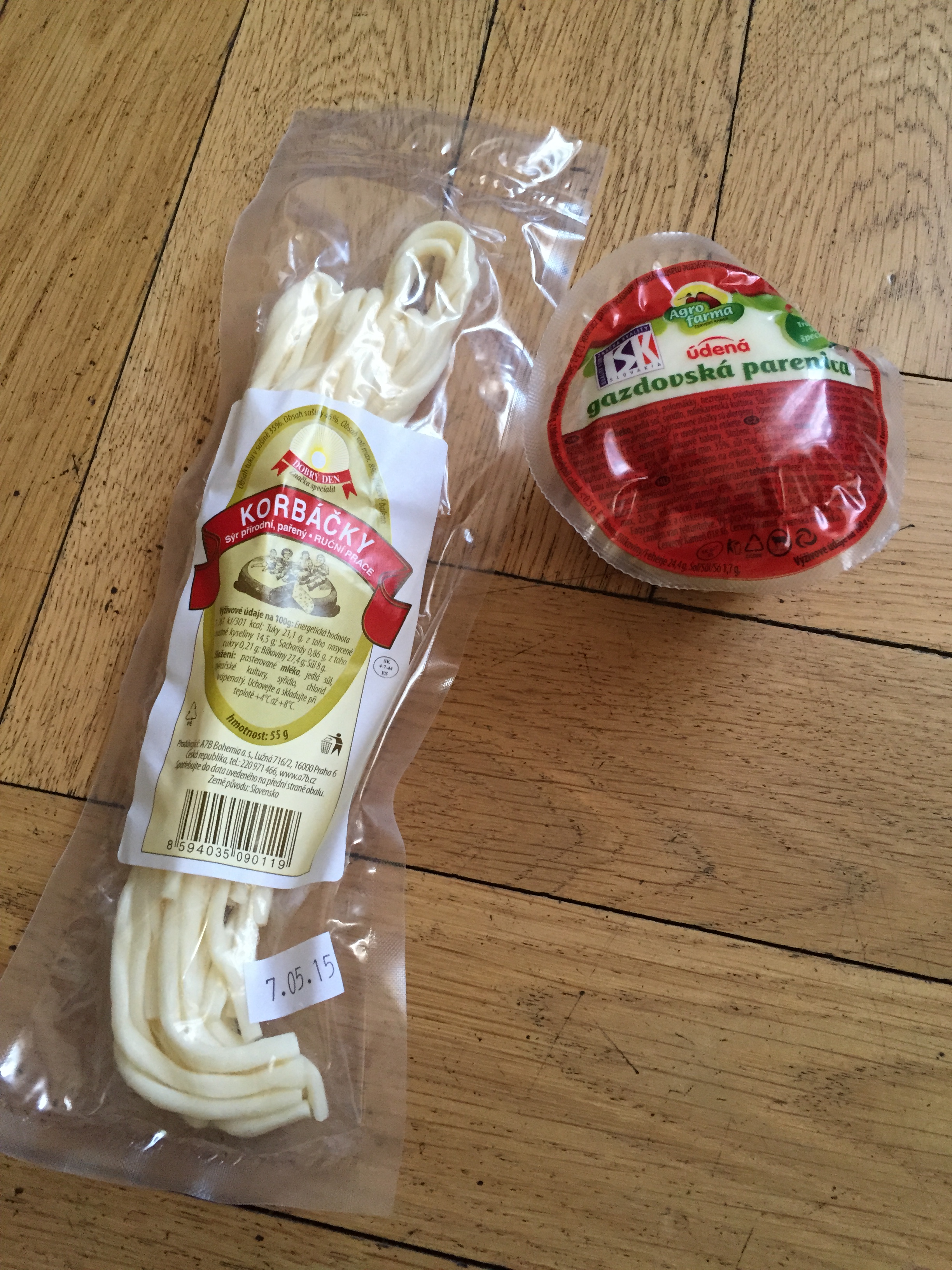 These are two Czech cheeses from the convenient store. The one on the left was stringy and looked like thick spaghetti noodles. It was extremely salty. The other one was less salty and actually edible. Both resembled mozzarella cheese.