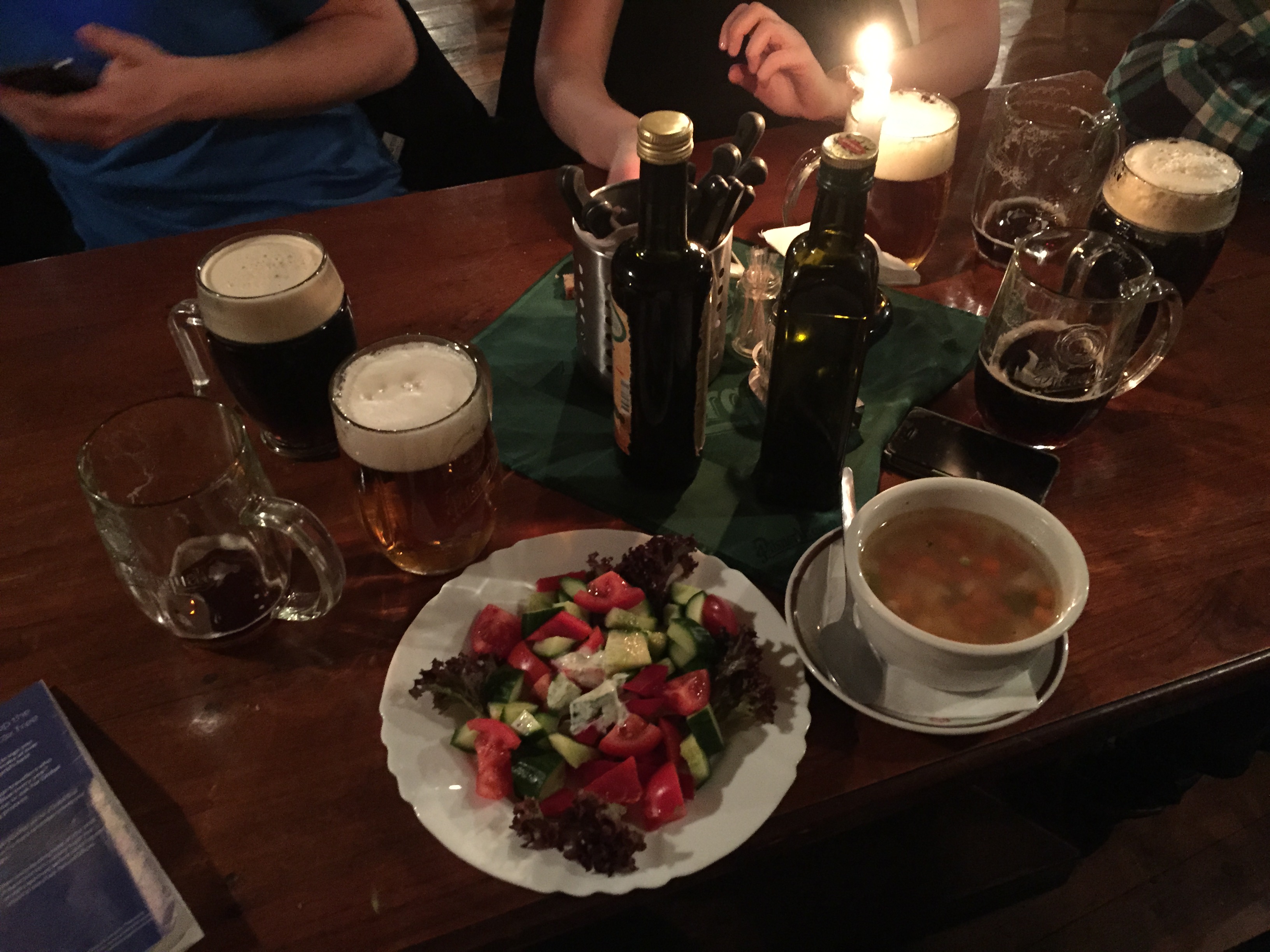 We ate dinner at a local bar. We got Olomouc fried cheese, which was a stinky cheese. I wished it would have come without the breading because I appreciate pungent cheese in its’ most natural form! We attempted to get a salad and it came with half pasta, half lettuce, and brie cheese, saturated in Caesar dressing. We also got lamb, dumplings, and spinach.
