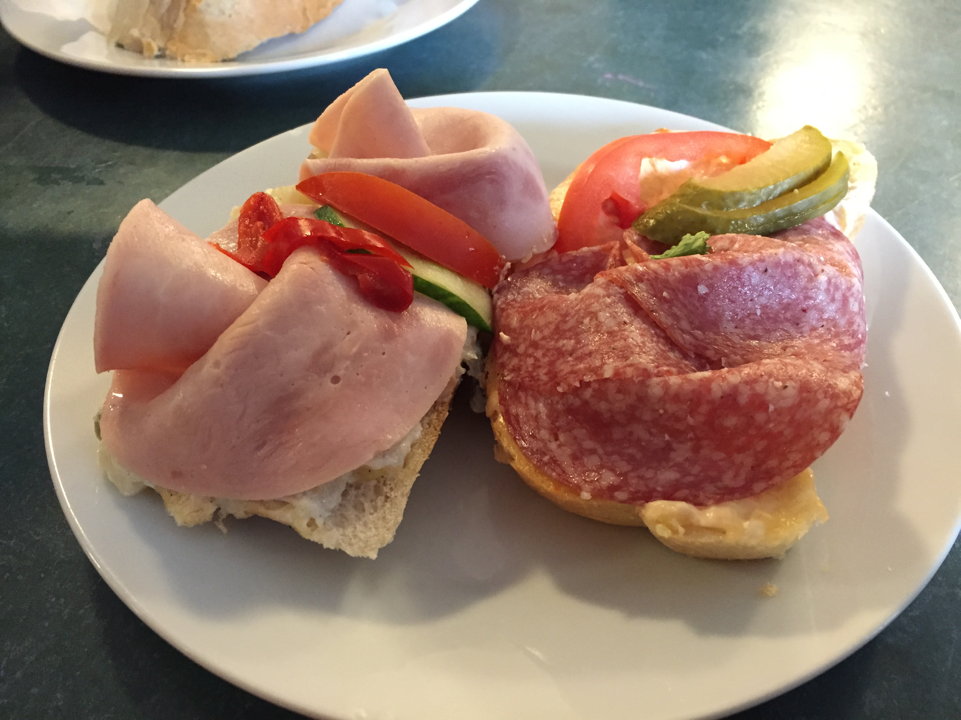 We got these two interesting looking combinations at a café in the library. One open faced sandwich had potato salad and turkey on it and the other had mayo and salami. Both had pickles and tomatoes on top. Our tour guide said that they serve these to their guests at house parties. They were very cheap (about 25 cents USD each)!