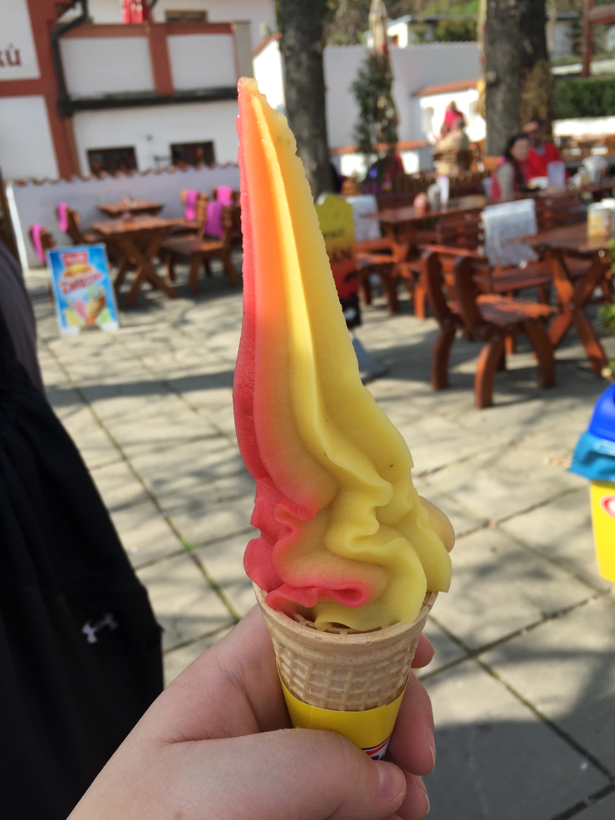 Strawberry banana swirl cream ice on a cone at the Praha Zoo.