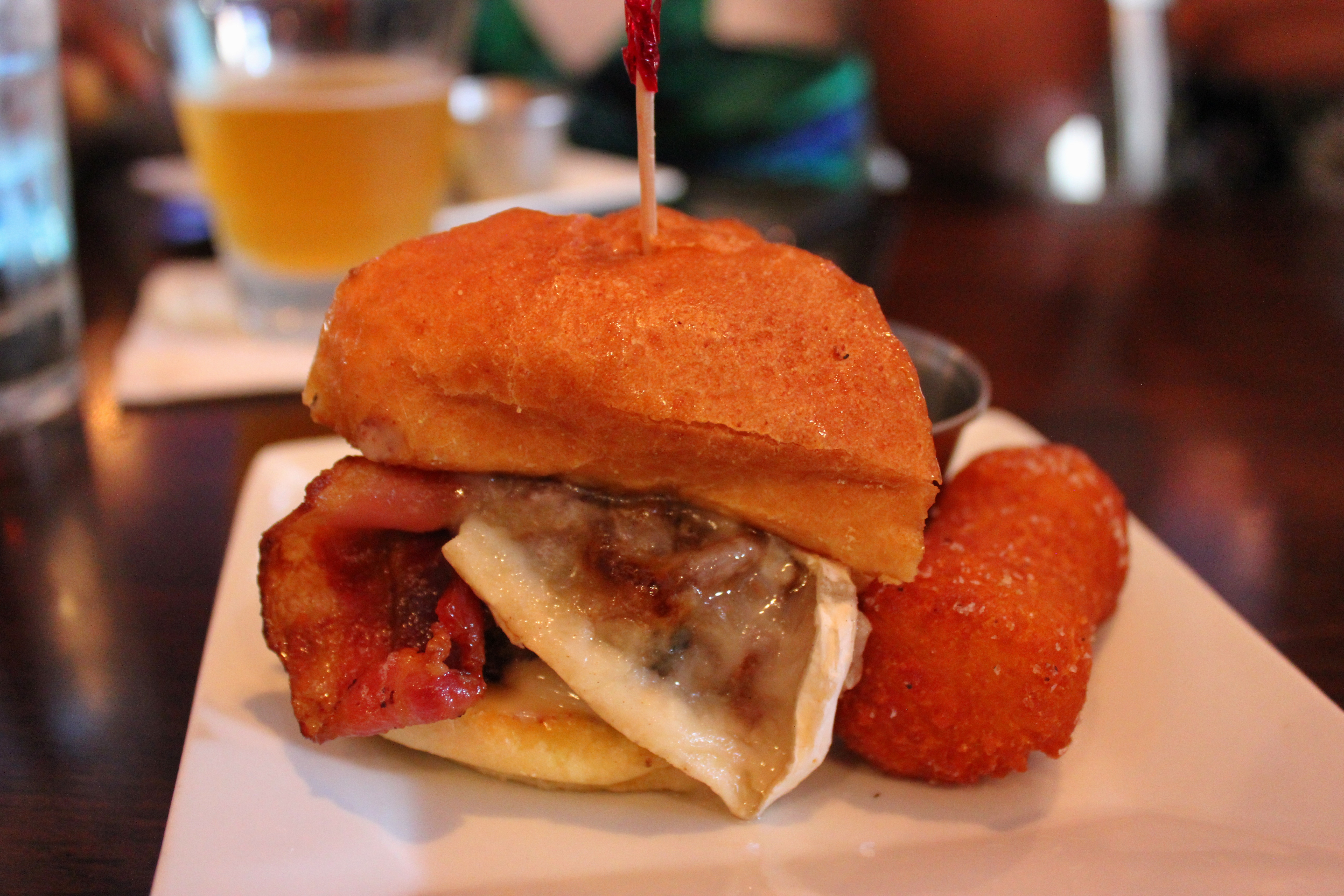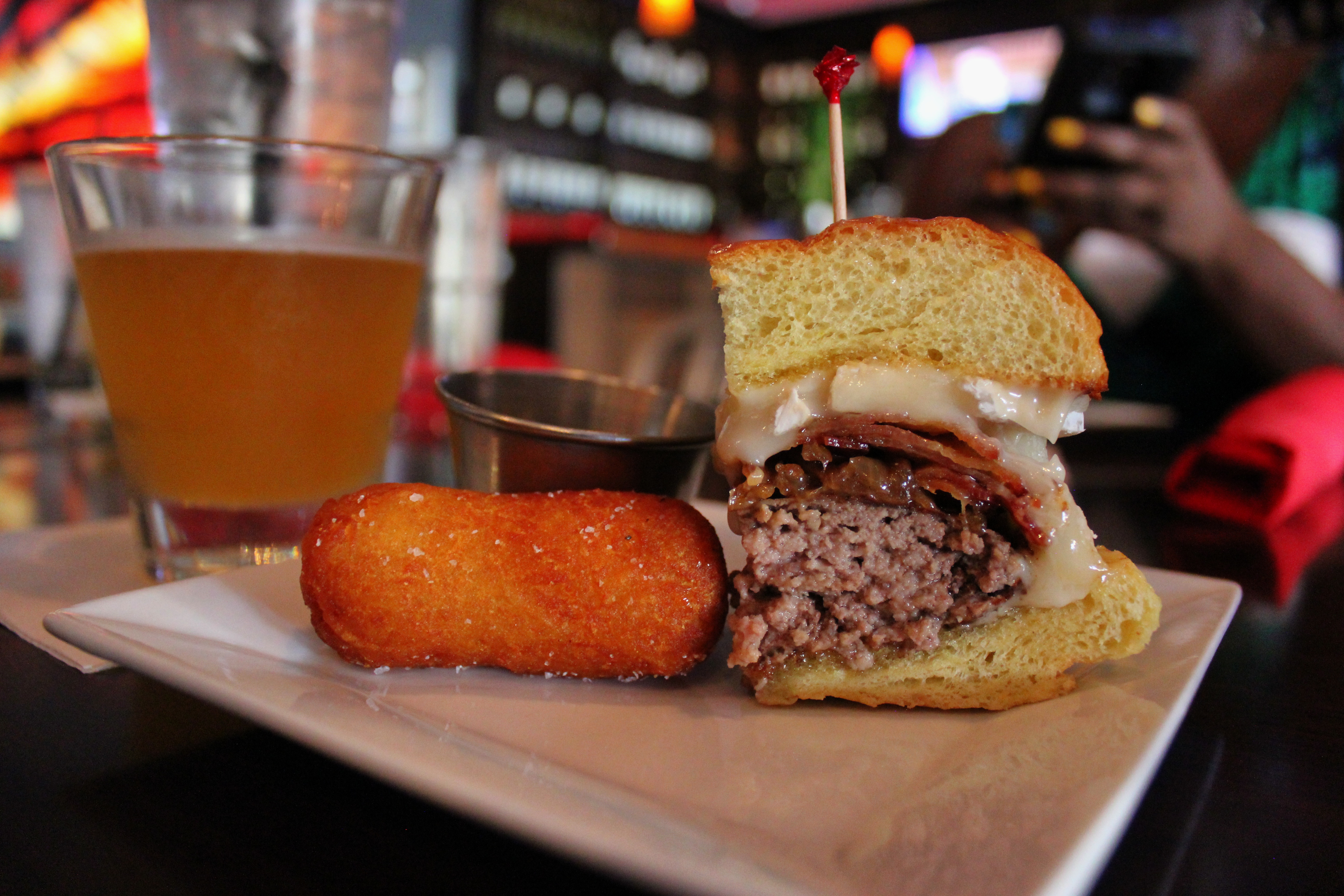 The Mind Your Manors “MYM” Burger — Three meat custom blend burger (short rib, brisket and chuck) with caramelized onion, brie cheese, and thick cut bacon and house prepared garlic mayo on a potato roll. This burger was so good I can see why it made it to the Burger Battle. Lets not forget about the giant home made tater bomb!