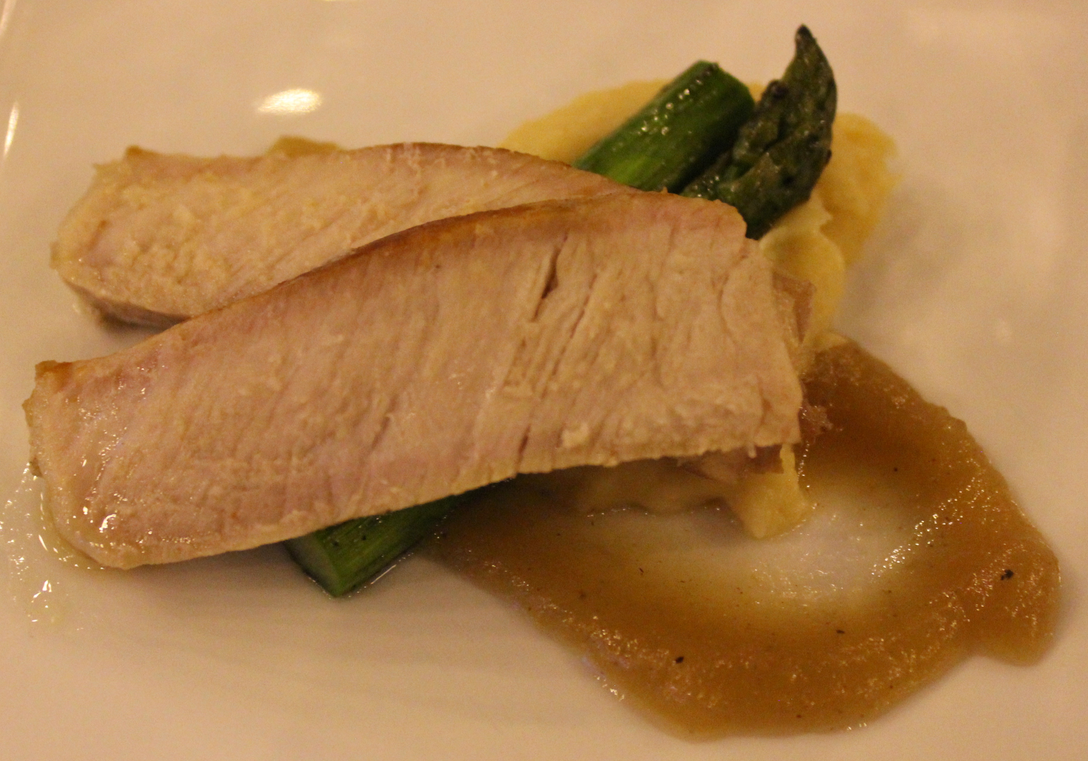 Pork Chop — butter and sage braised bone in chop served on parsnip mash and apple butter with grilled garlic asparagus.