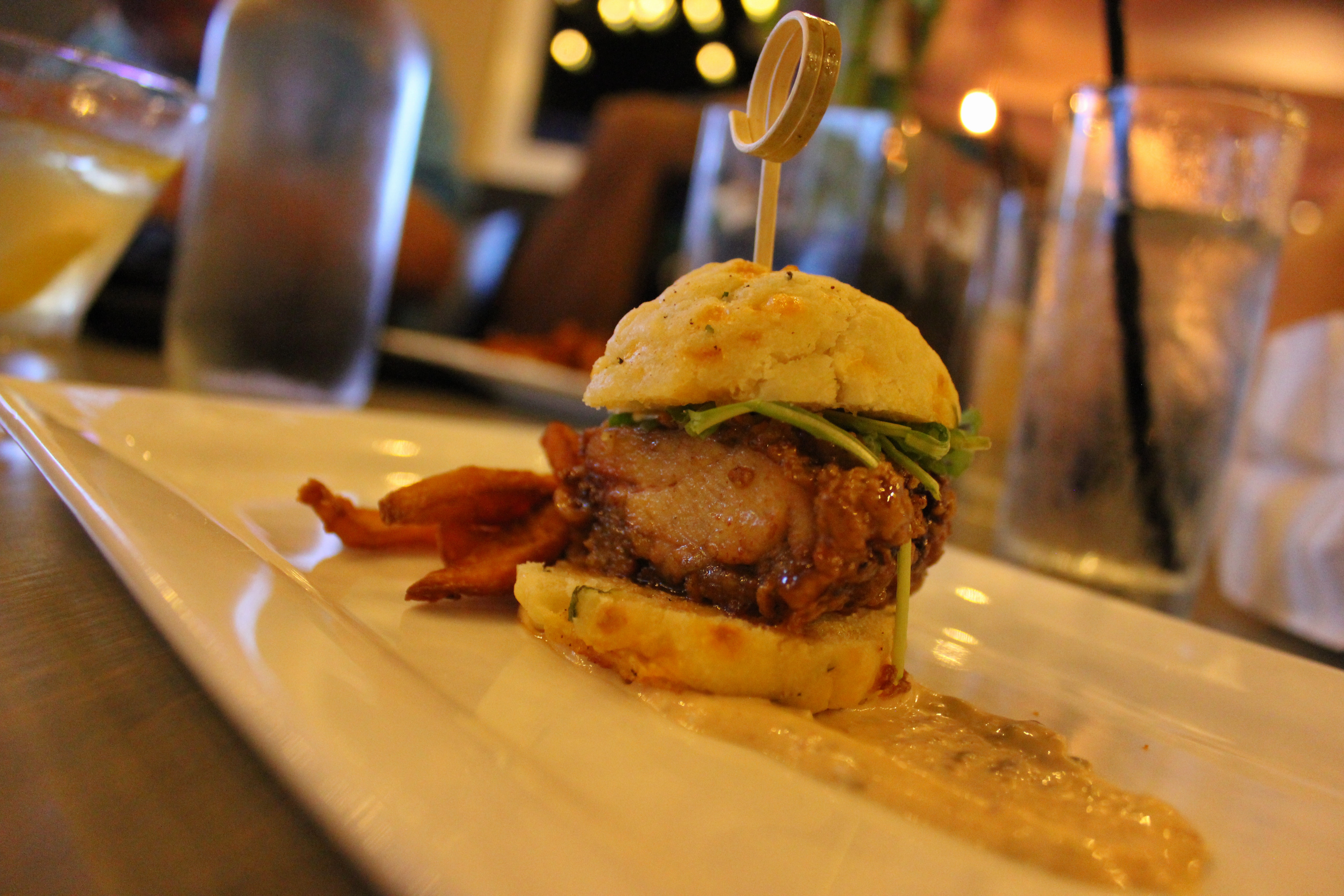 Fried Chicken Slider house — made cheddar biscuits with fried chicken tossed in Sriracha maple syrup. Served with sweet potato fries.