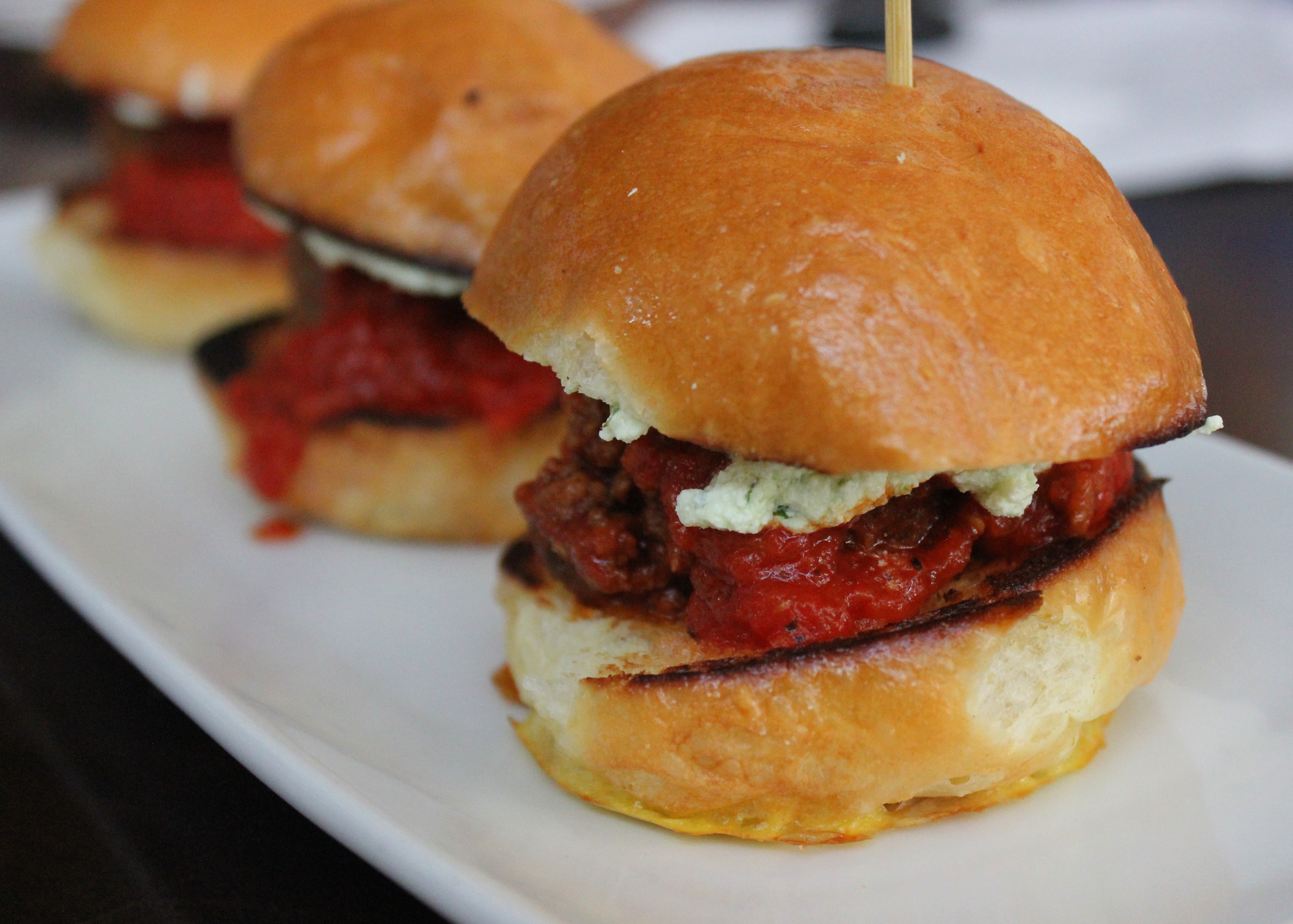 MEATBALL SLIDERS — tomato sauce, basil pesto ricotta, toasted brioche, served with simple green salad