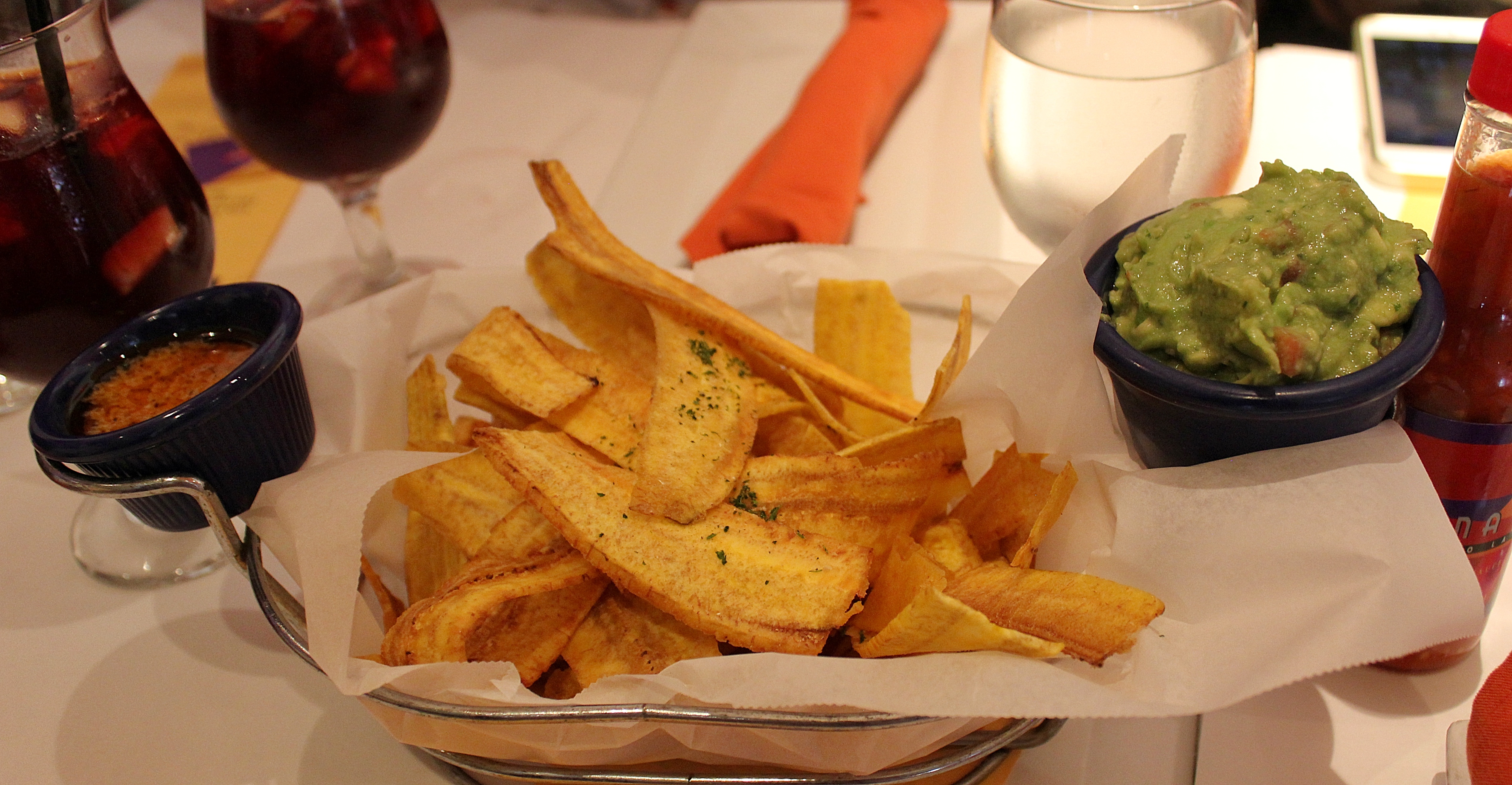 Mariquitas with homemade guacamole and mojo dipping sauce.