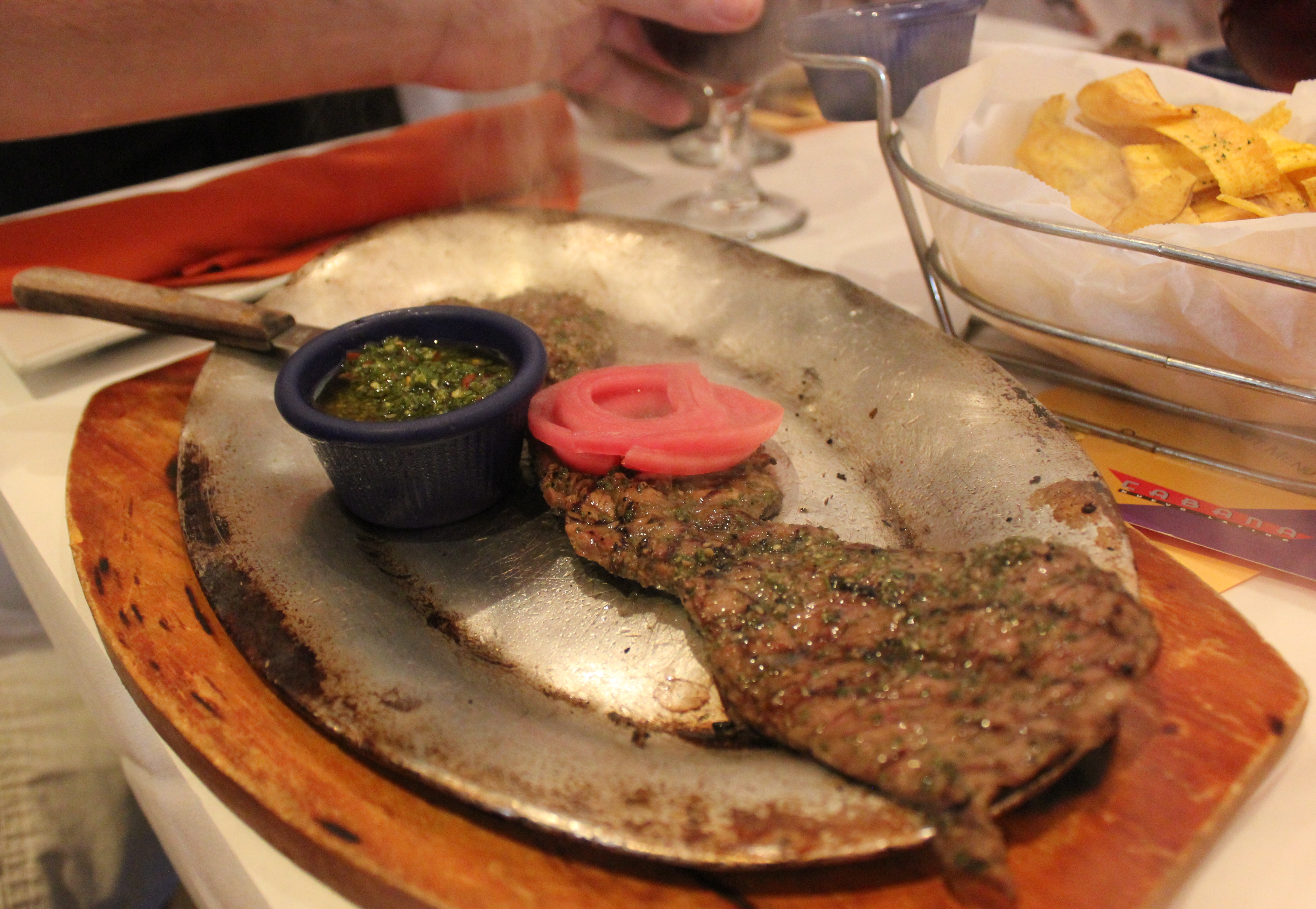Chimichurri Churrasco garnished with onions that are pickled in house.