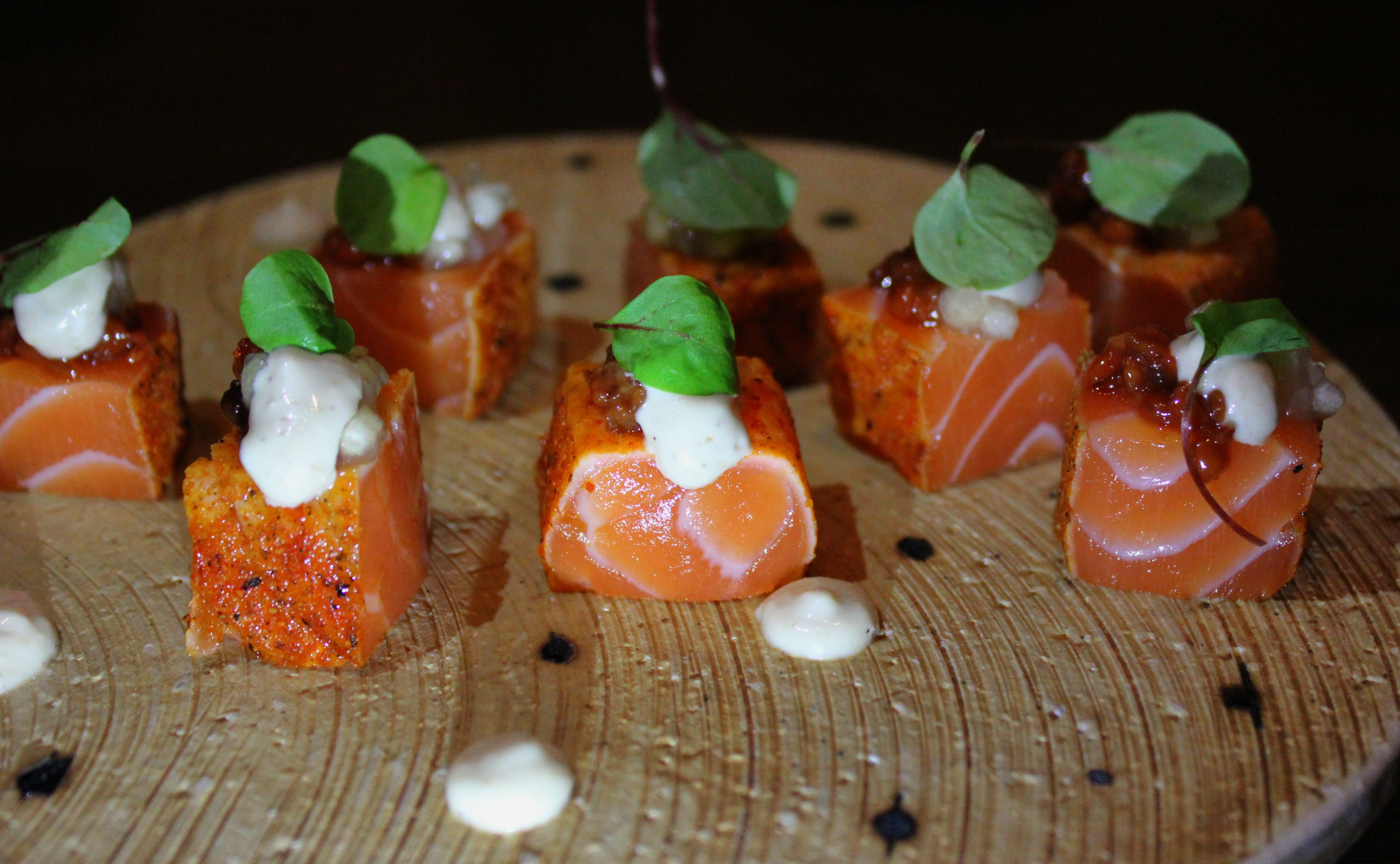 Seared Salmon Sashimi with apple chutney, Japanese 12 spice and creamy sesame