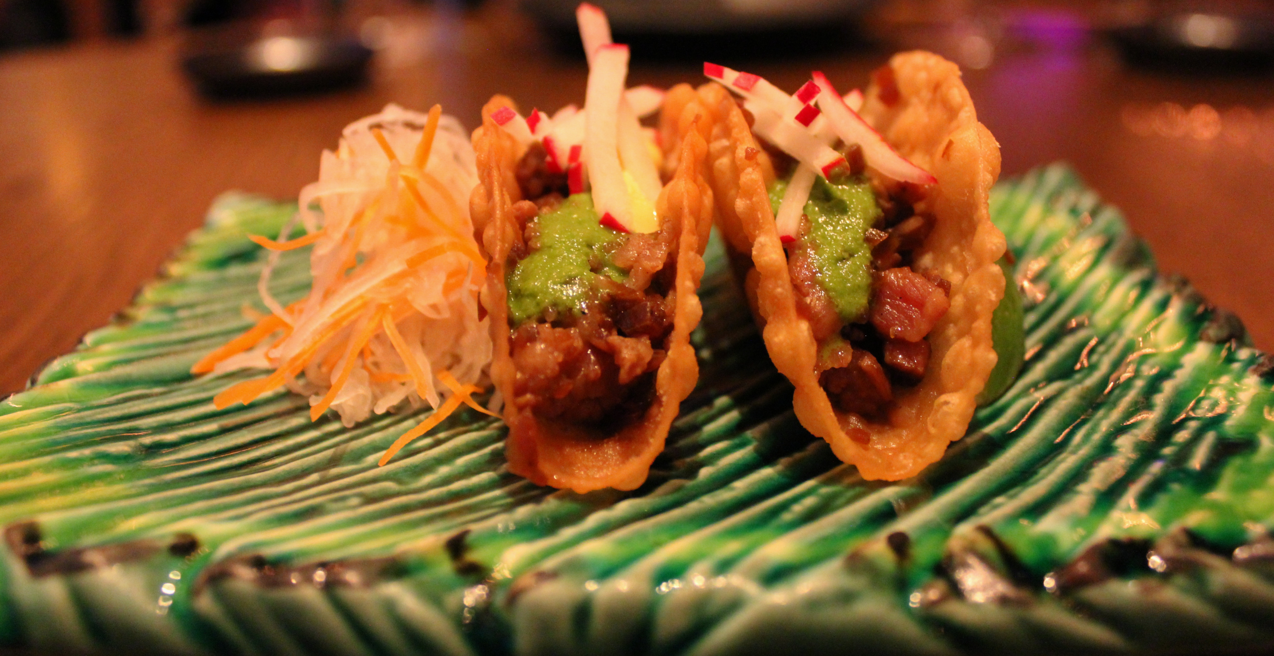 Wagyu Tacos with spicy cilantro, soy shallots and aji Amarillo aioli