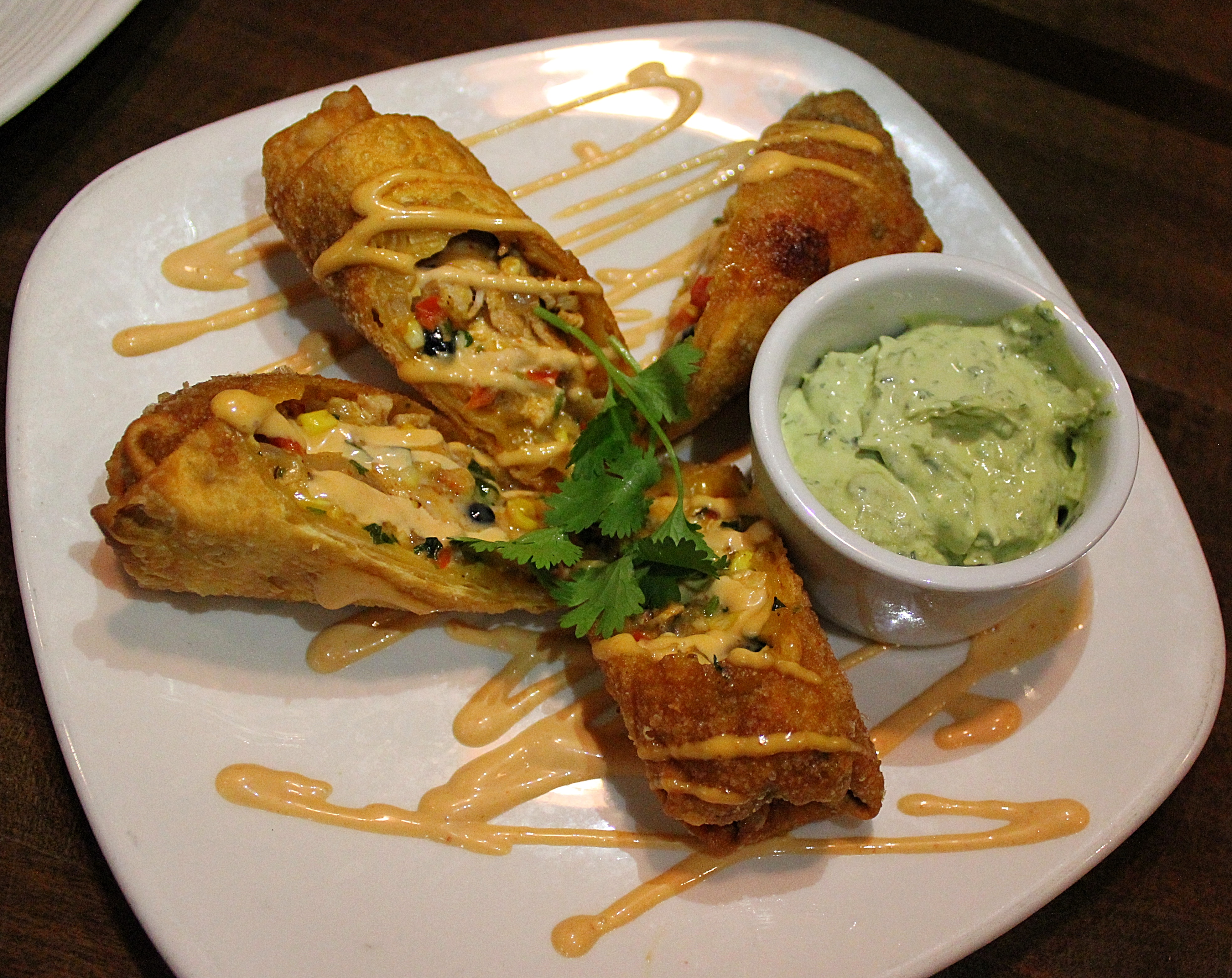 - Southwestern Egg Rolls made with wonton wraps, pulled chicken, black beans, corn, red peppers and onions drizzled with spicy mayo and served with avocado cilantro sour cream