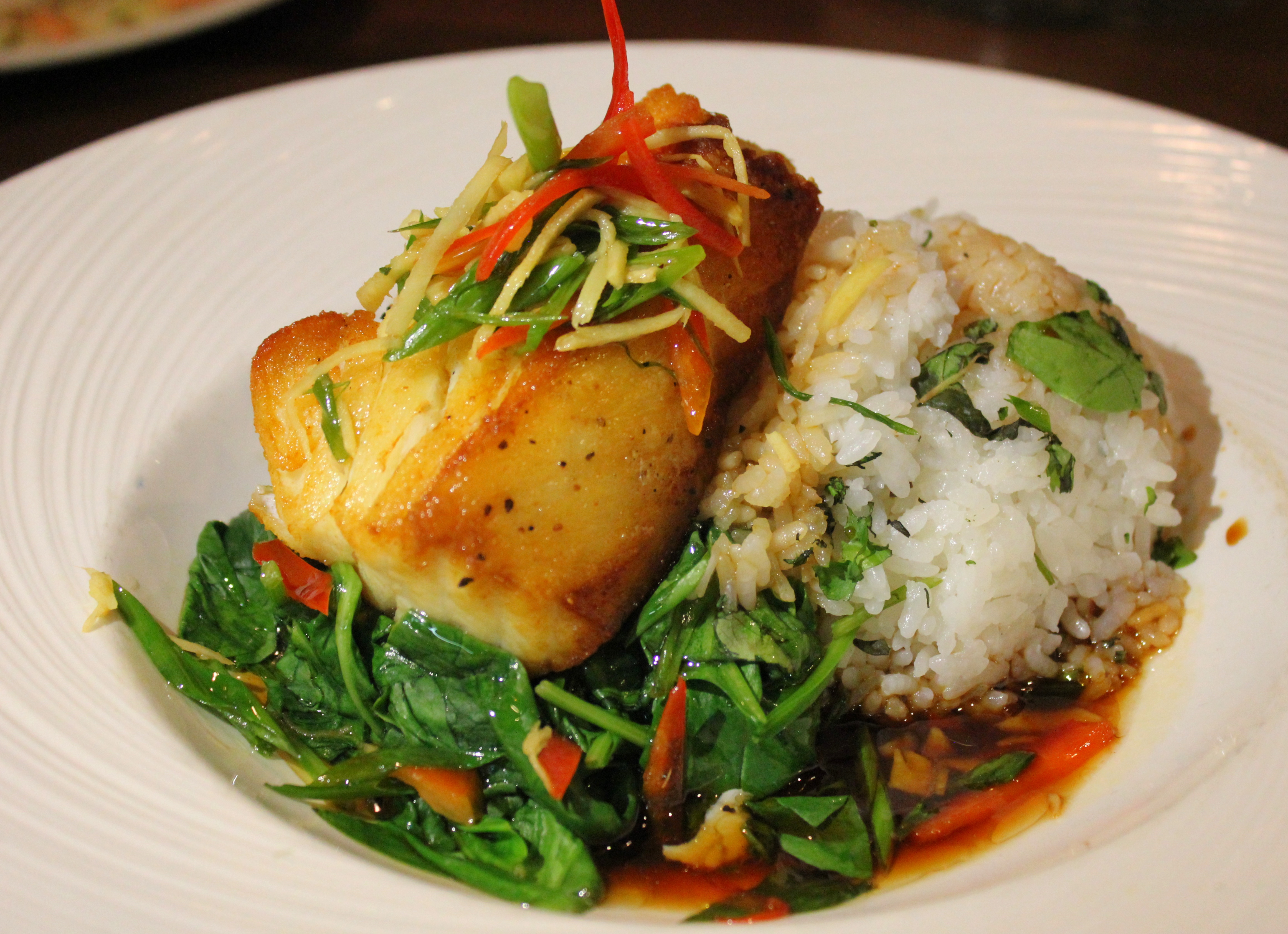 Asian Sea Bass – Sautéed Chilean Sea Bass with a Sherry & Soy Broth served with cilantro-mint sticky rice and fresh spinach & seared vegetables. This is Chef Troy’s favorite dish, and I can taste why!