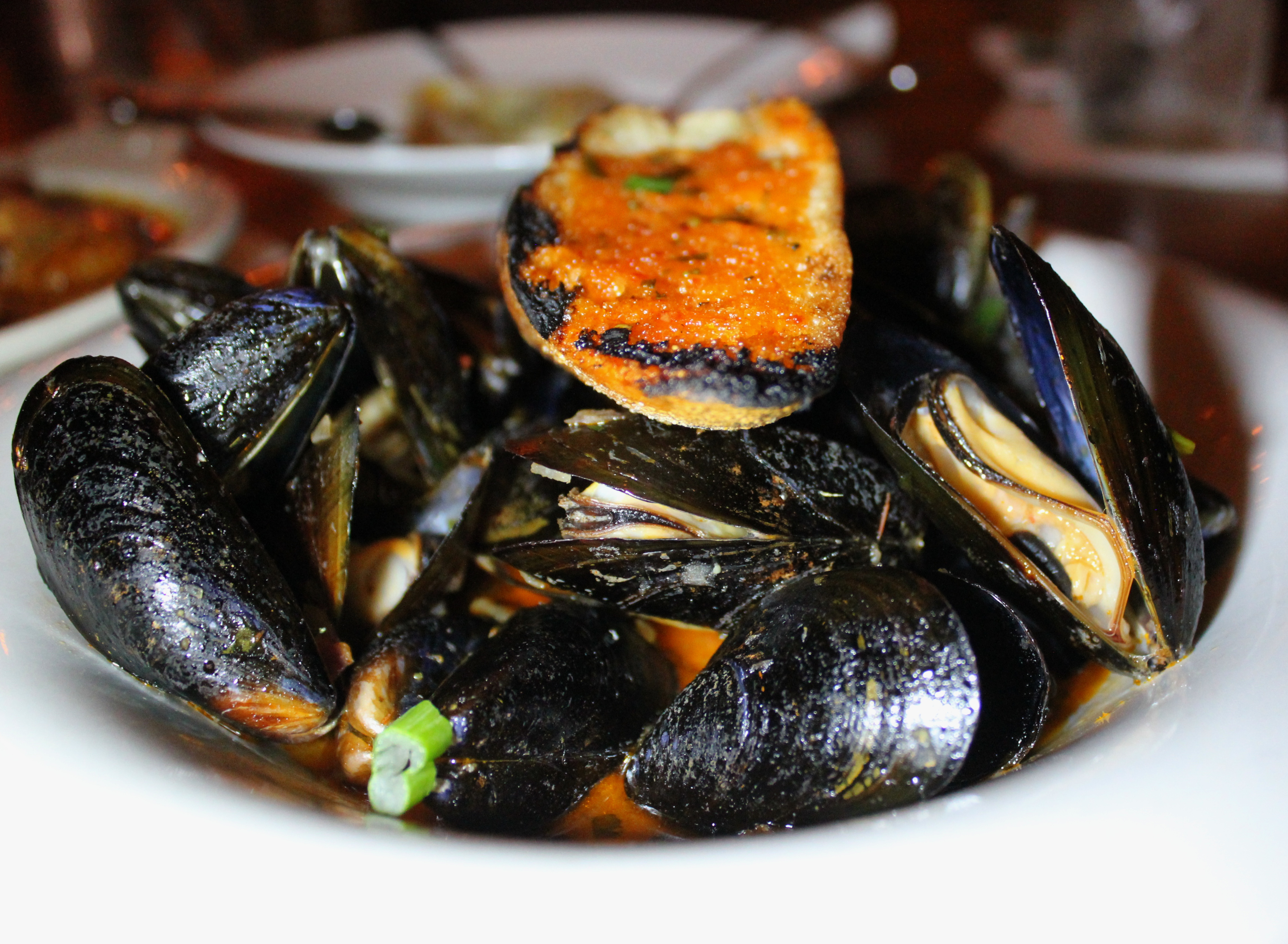 NEW: Chili Garlic Mussels (starter) – white wine, ginger, garlic, chili, cilantro, grilled baguette